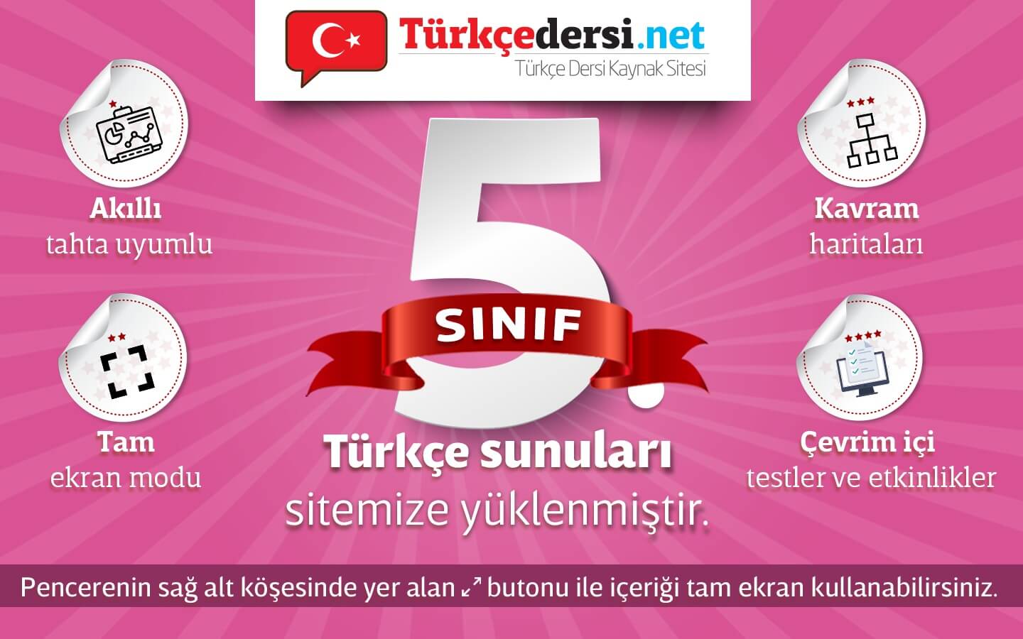 5. sınıf Türkçe konularını içeren “Türkçe Ders Sunuları” sitemize yüklenmiştir. Bu sunularda konu anlatımı, interaktif etkinlikler ve testler bulunmaktadır. Sunularımızı akıllı tahtalarda tam ekran yaparak (Sağ alt köşedeki ok simgesi ile tam ekran yapabilirsiniz.) kullanmanızı öneriyoruz.