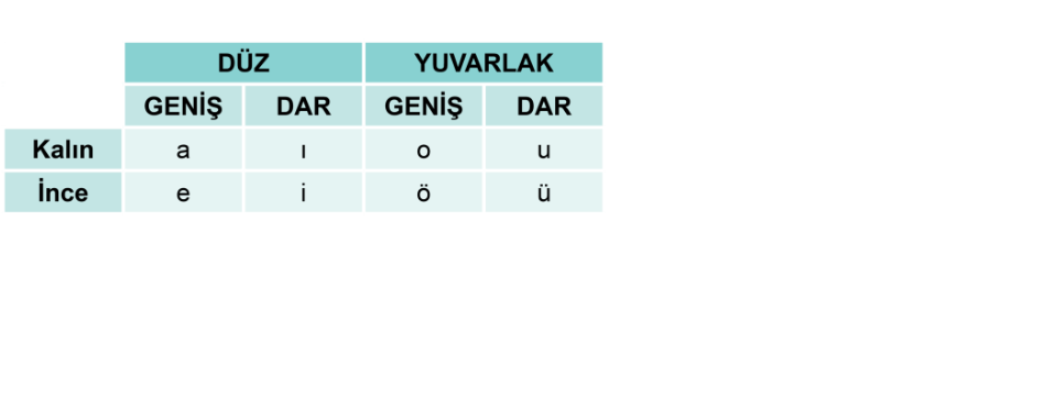 Sesli harfler: a, e, ı, i, o, ö, u, ü