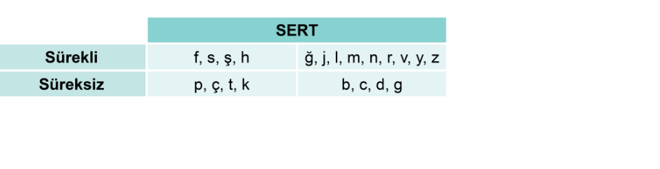 Sessiz harfler: b, c, ç, d, f, g, ğ, h, j, k, l, m, n, p, r, s, ş, t, v, y, z