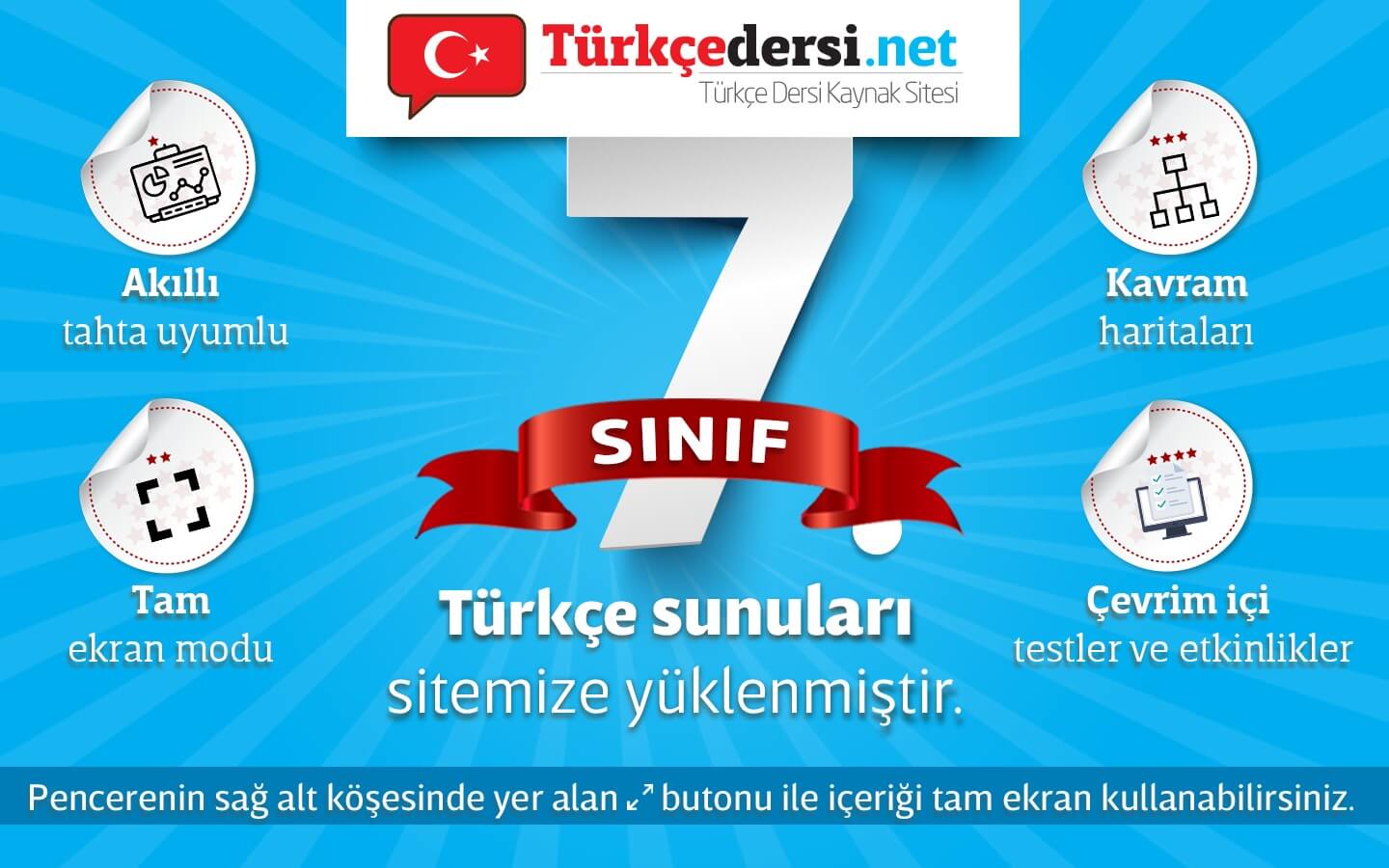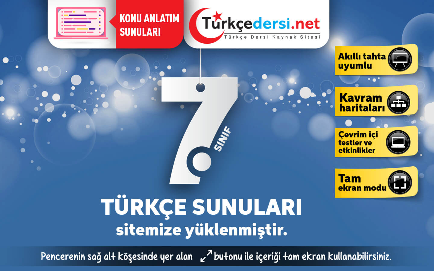 7. sınıf Türkçe konularını içeren “Türkçe Ders Sunuları” sitemize yüklenmiştir. Bu sunularda konu anlatımı, interaktif etkinlikler ve testler bulunmaktadır. Sunularımızı akıllı tahtalarda tam ekran yaparak (Sağ alt köşedeki ok simgesi ile tam ekran yapabilirsiniz.) kullanmanızı öneriyoruz.