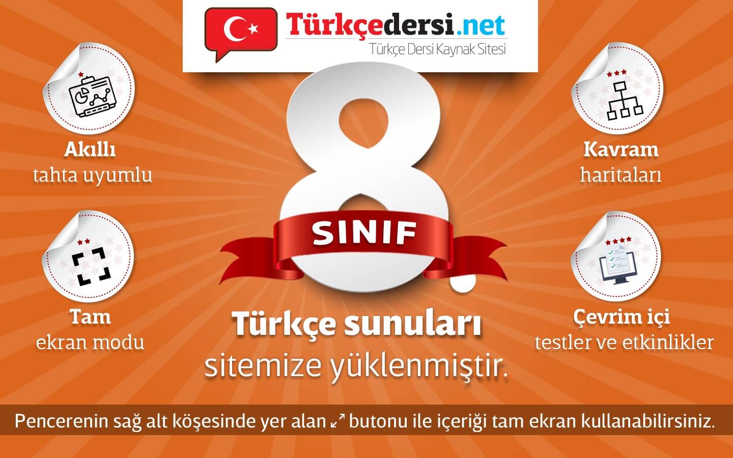 8. sınıf Türkçe konularını içeren “Türkçe Ders Sunuları” sitemize yüklenmiştir. Bu sunularda konu anlatımı, interaktif etkinlikler ve testler bulunmaktadır. Sunularımızı akıllı tahtalarda tam ekran yaparak (Sağ alt köşedeki ok simgesi ile tam ekran yapabilirsiniz.) kullanmanızı öneriyoruz.
