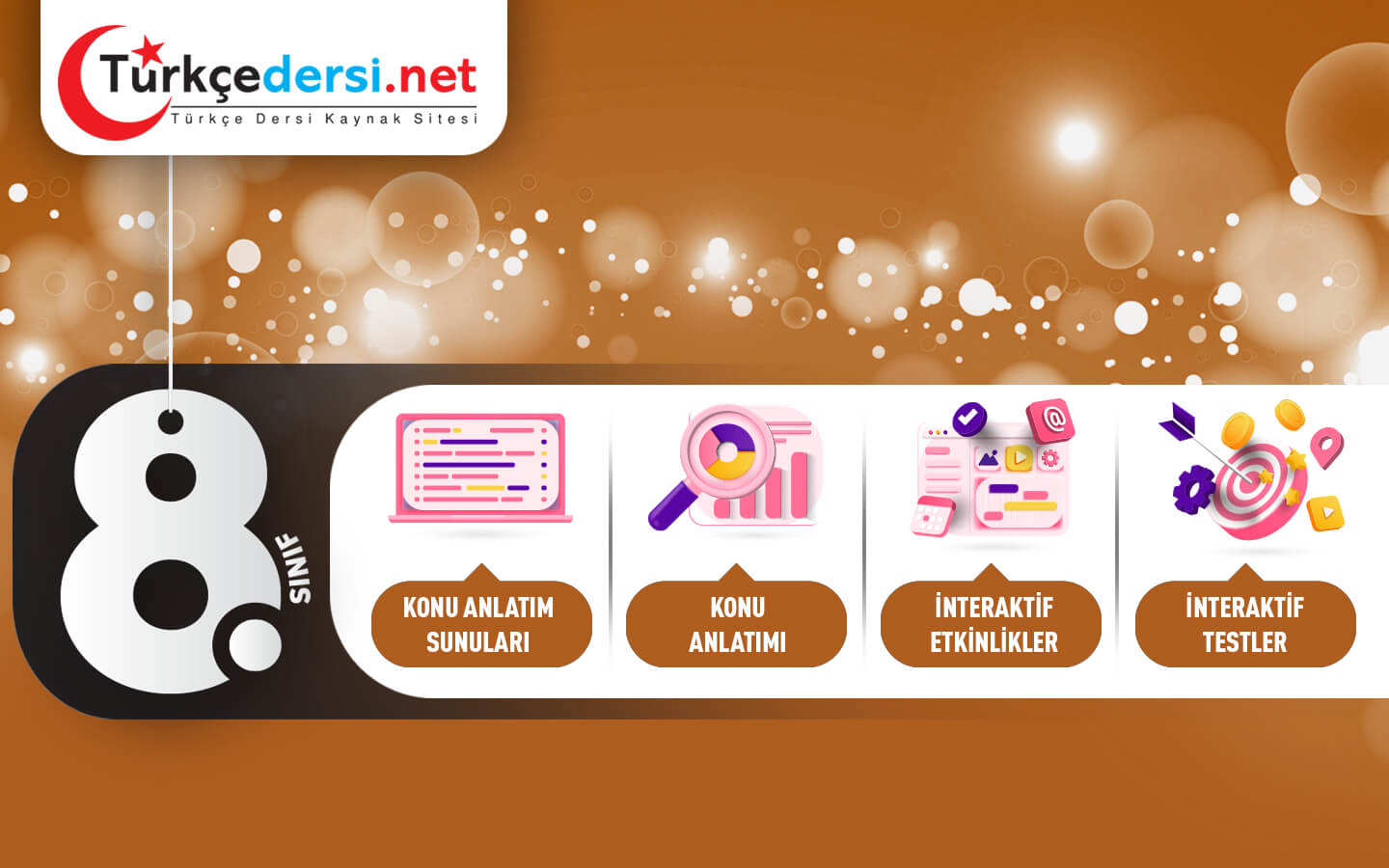 8. Sınıf Türkçe konularına ait “Konu Anlatım Sunusu, Konu Anlatımı, İnteraktif Etkinlikler ve İnteraktif Testler” gibi içeriklere aşağıdaki butonlardan ulaşabilirsiniz.