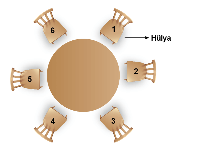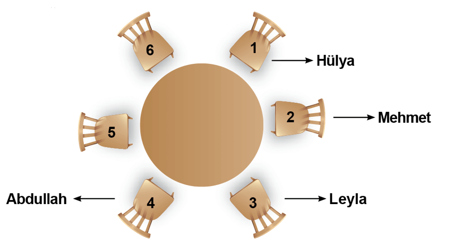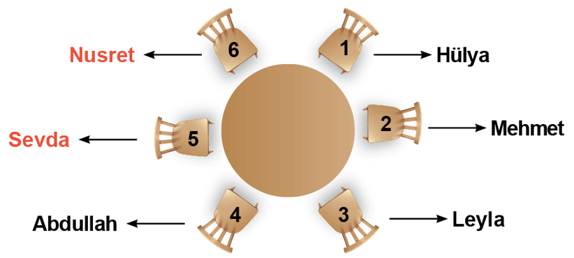 Yukarıda gösterilen yuvarlak bir masanın etrafında Nusret, Abdullah, Hülya, Mehmet, Leyla ve Sevda oturmaktadır. Oturma düzeni ile ilgili şunlar bilinmektedir: