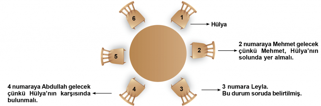 Bu tip sorularda “sağında, solunda” gibi yönler kullanıldığında aksi belirtilmedikçe kendi bakışımıza göre değil masadaki kişilerin duruşlarına göre yönler kullanılmalıdır. Örneğin Mehmet’in 2 numaraya gelmesinin nedeni, bu yerin Hülya’nın solunda bulunmasıdır.