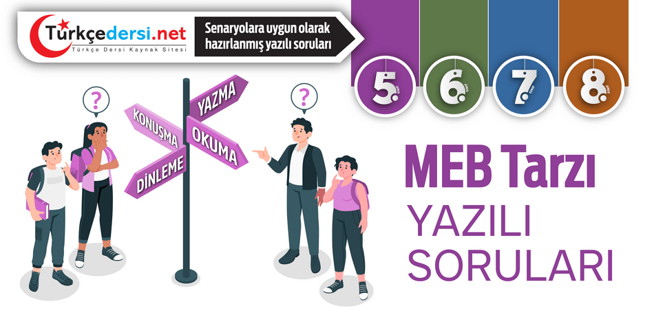 5, 6, 7 ve 8. sınıf seviyelerinde MEB’in yayımladığı senaryolara göre hazırlanan Türkçe yazılılarını, cevap anahtarlarıyla sitemizde bulabilirsiniz. Sitemizde yayımlamak istediğiniz benzer formattaki yazılılarınızı cevap anahtarını da oluşturarak buraya tıklayarak WhatsApp’tan (0532 155 31 69) bize gönderebilirsiniz. Gönderdiğiniz bu yazılılar, sizin isminizle sitemizde paylaşılacaktır.